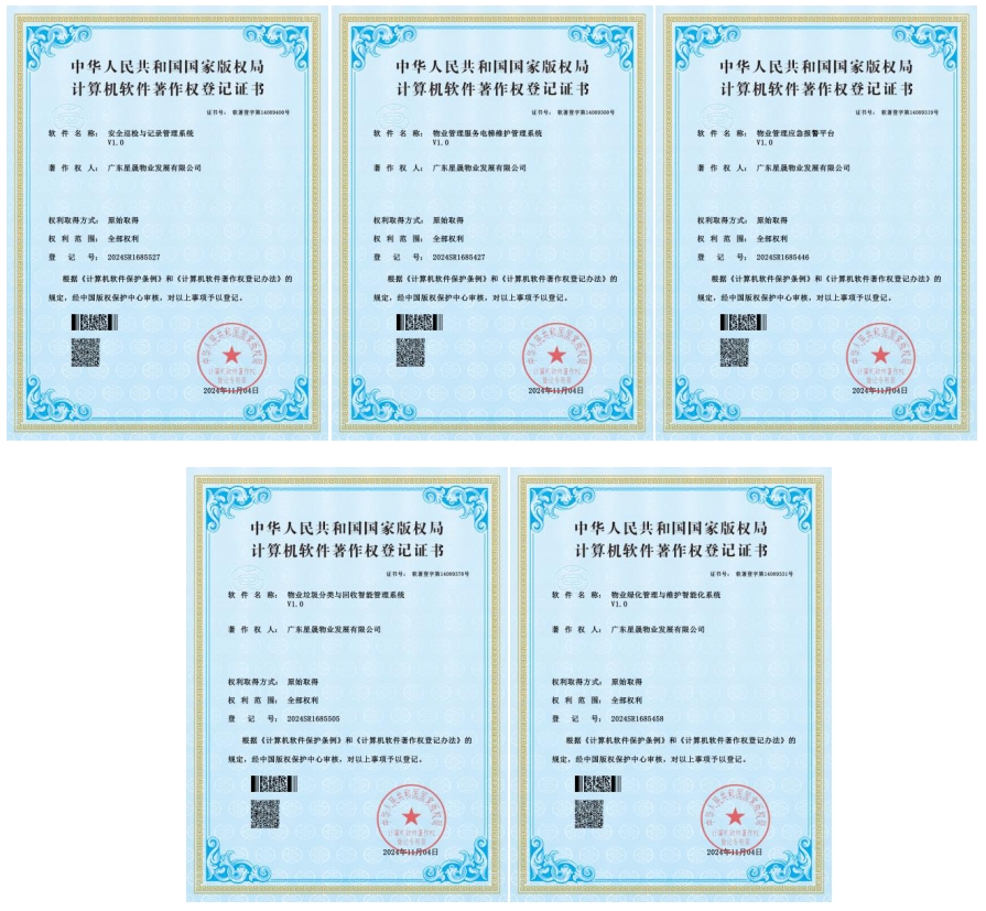 近日,汕尾投控下屬企業(yè)廣東星晟物業(yè)發(fā)展有限公司榮獲國(guó)家版權(quán)局頒發(fā)的6項(xiàng)物業(yè)管理類計(jì)算機(jī)軟件著作權(quán)登記證書,包括“智能物業(yè)保潔一體化服務(wù)系統(tǒng)”“物業(yè)垃圾分類與回收智能管理系統(tǒng)”“物業(yè)綠化管理與維護(hù)智能化系統(tǒng)”“物業(yè)管理服務(wù)電梯維護(hù)管理系統(tǒng)”“物業(yè)管理應(yīng)急報(bào)警平臺(tái)”“安全巡檢與記錄管理系統(tǒng)”,連同此前獲得的國(guó)家專利局頒發(fā)的園林綠化管養(yǎng)類實(shí)用新型專利1項(xiàng),星晟物業(yè)公司累計(jì)獲得自有知識(shí)產(chǎn)權(quán)證書已達(dá)7項(xiàng)。 這充分體現(xiàn)了星晟物業(yè)在物業(yè)管理領(lǐng)域的創(chuàng)新實(shí)力,為推動(dòng)星晟物業(yè)高質(zhì)量發(fā)展奠定了堅(jiān)實(shí)基礎(chǔ)。展望未來(lái),星晟物業(yè)公司將緊緊圍繞市投控公司“5+1+N”業(yè)務(wù)板塊,充分利用平臺(tái)資源優(yōu)勢(shì),深入實(shí)施新型國(guó)企的發(fā)展戰(zhàn)略。始終堅(jiān)持“拓展市場(chǎng)、優(yōu)化服務(wù)、強(qiáng)化管理”的工作主線,以“新發(fā)展”“智取勝”為方向,不斷提升物業(yè)管理的專業(yè)水平和物業(yè)服務(wù)品質(zhì),助力汕尾物業(yè)管理行業(yè)高質(zhì)量發(fā)展。